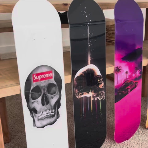 Each acrylic skateboard is hand-heated and bent to mimic the natural curve of a real deck. This process gives the piece the dimension and shadow of a skateboard — not just a flat print on the wall.
